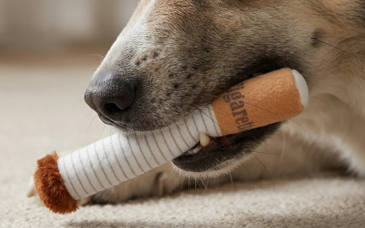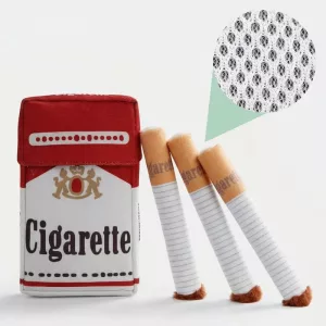 De fleece-sigarettenset als grap gekocht, maar onze hond nam ze serieus en speelt nu apporteerspelletjes, knuffelt ermee en neemt er elke avond eentje mee naar bed.
