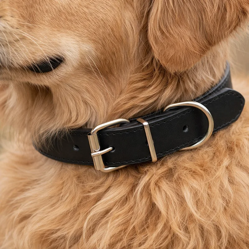 Onze hond draagt deze elke dag. Hij past perfect en ziet er zo cool uit. Het materiaal laat helemaal geen sporen achter op zijn nek.