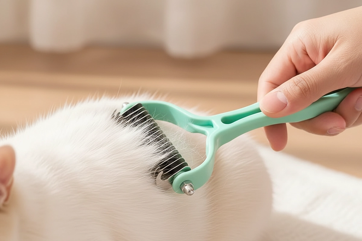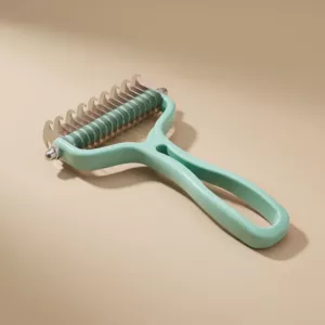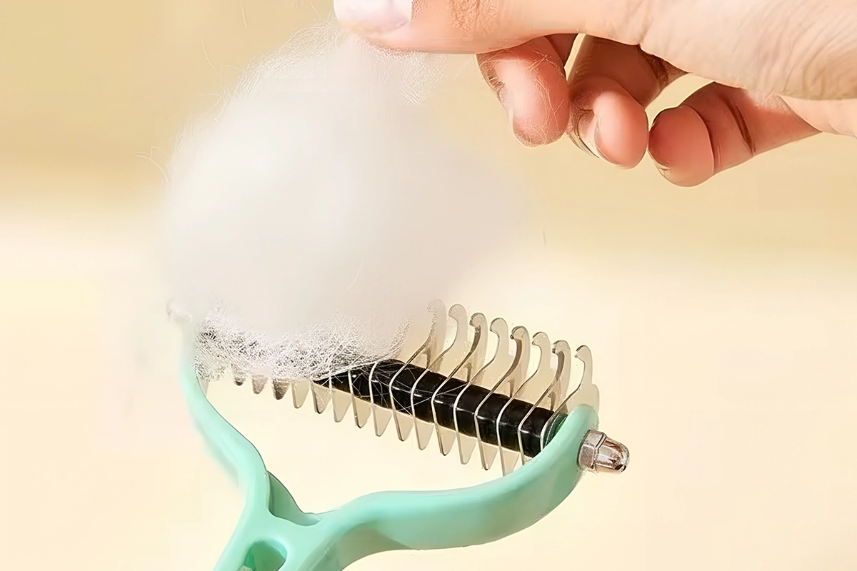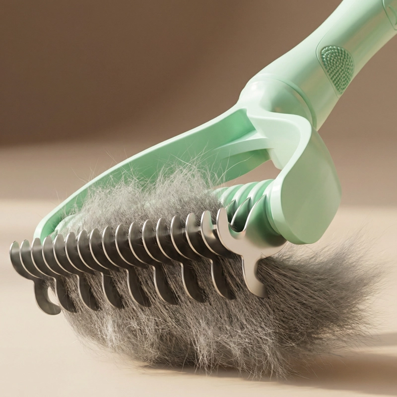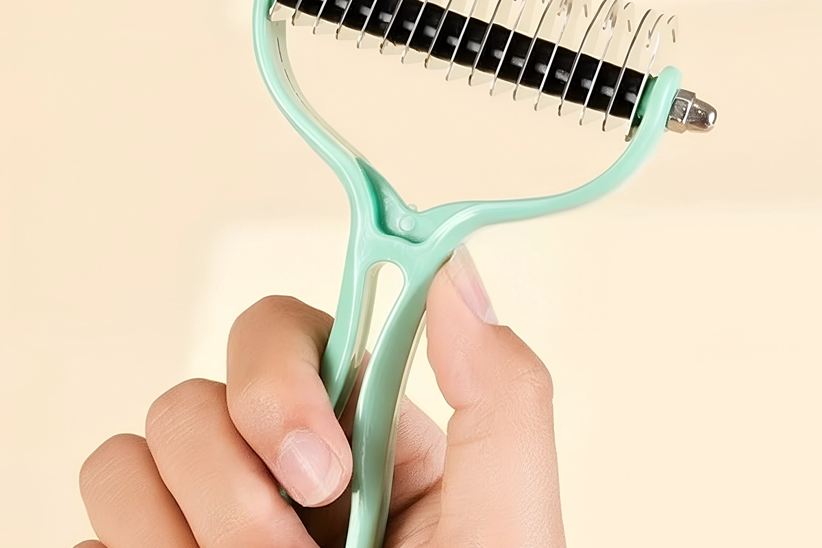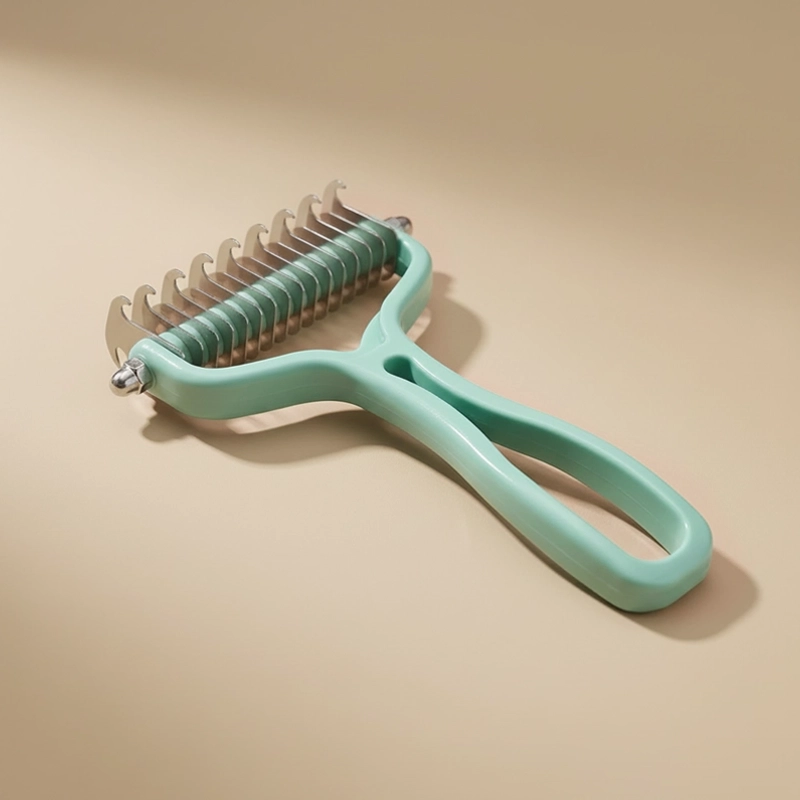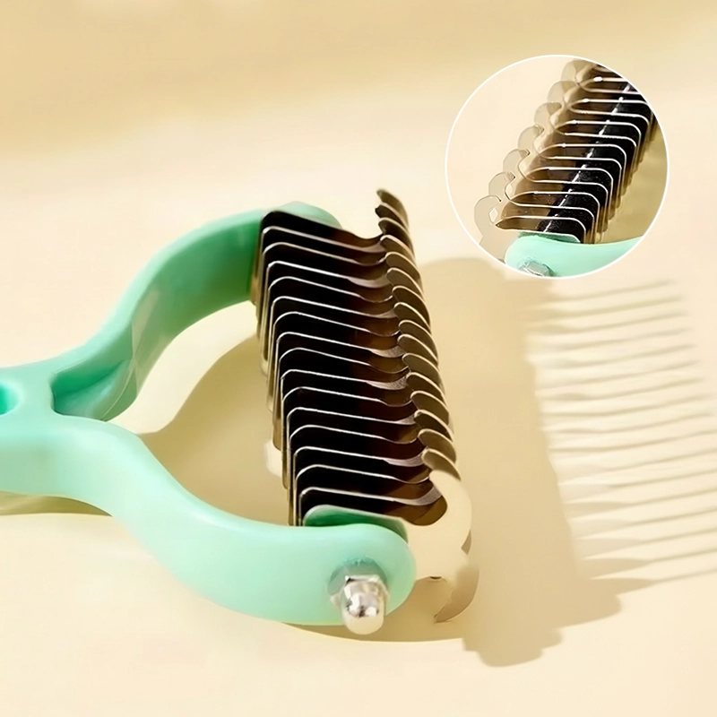 Scherpe roestvrijstalen messen glijden soepel door de vachtlagen. Ze ontwarren klitten zonder aan de gevoelige huid te trekken of te krassen.