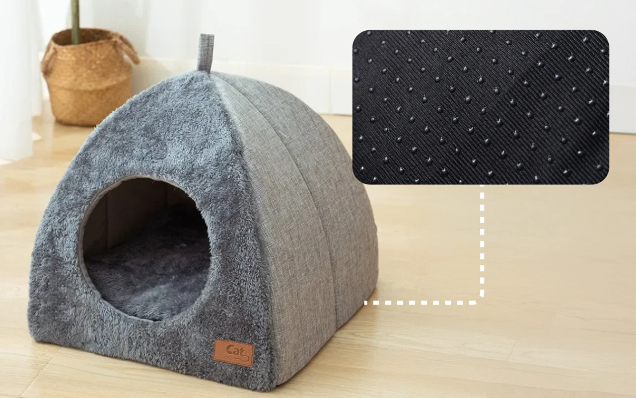 Onze woonkamer heeft een gladde vloer, maar de onderkant van de iglo houdt hem op zijn plek. Het ziet er super schattig uit en mijn kat geniet van haar nieuwe privéplek.