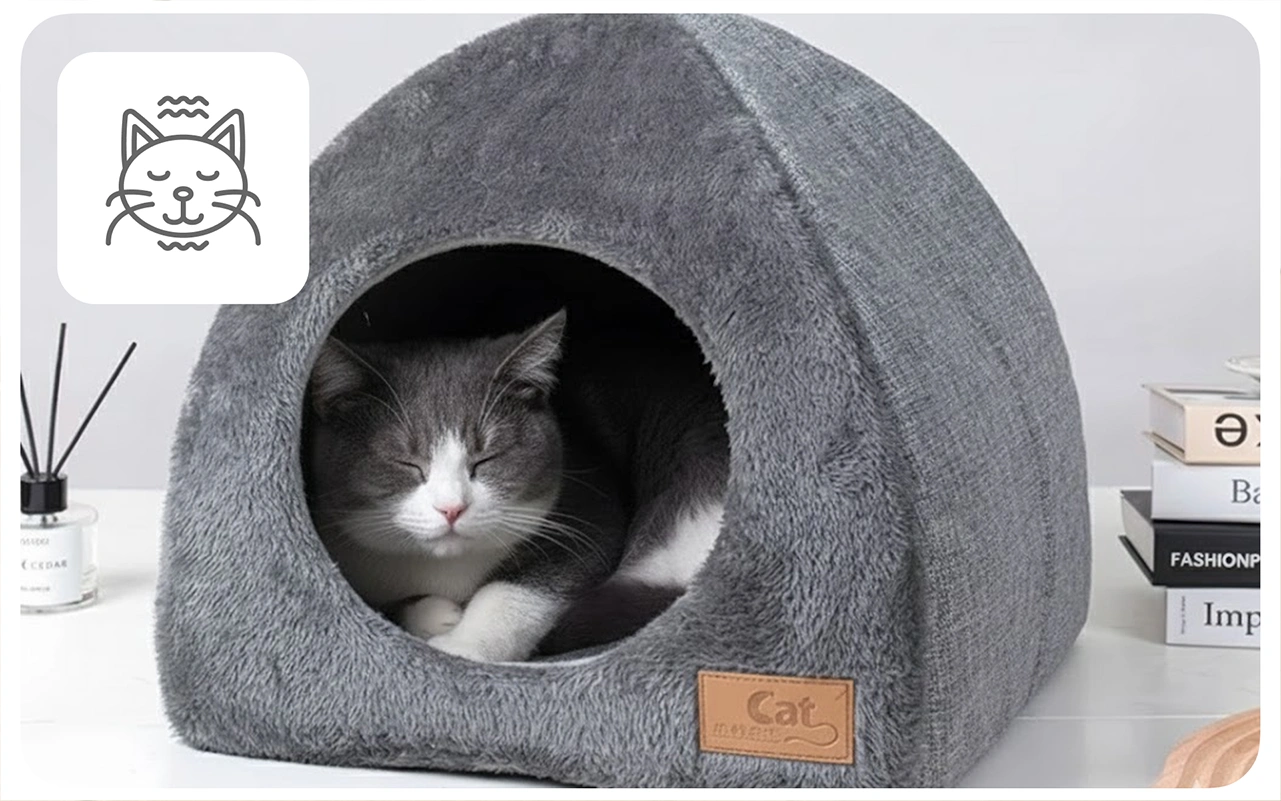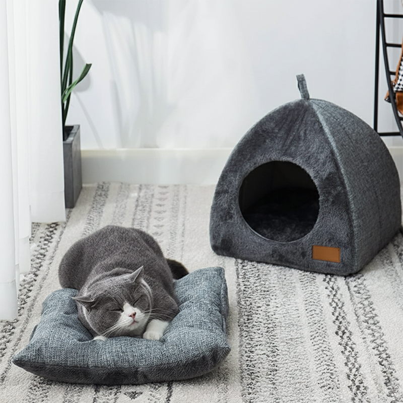 De driehoekige vorm biedt privacy, waardoor stress en angst snel afnemen. Katten voelen zich beschermd binnenin en genieten van stille momenten wanneer ze dat nodig hebben.