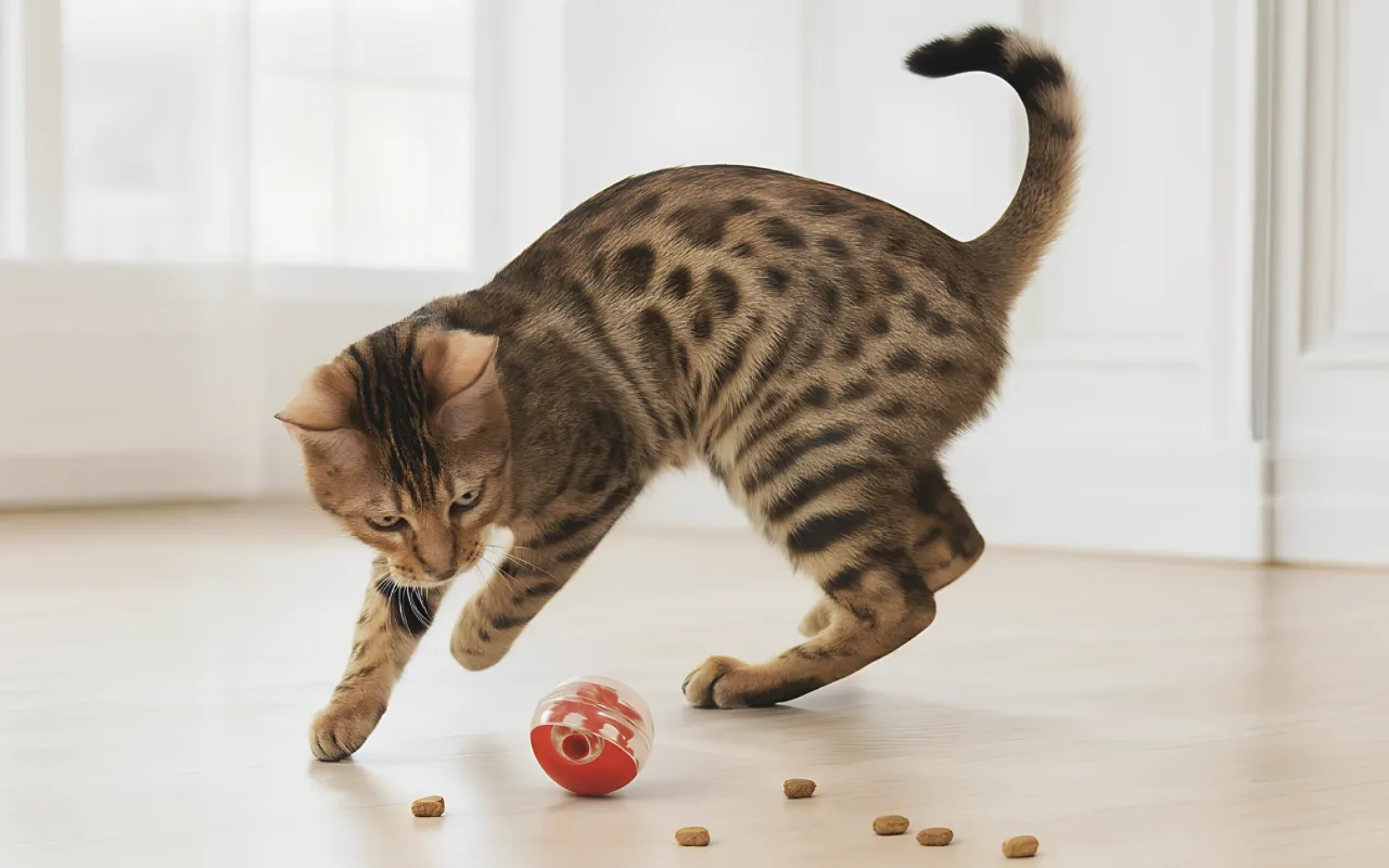 Katten achtervolgen de Primdog Treat Ball voor smakelijke verrassingen. Het wekt natuurlijke jachtinstincten op en houdt ze in beweging.