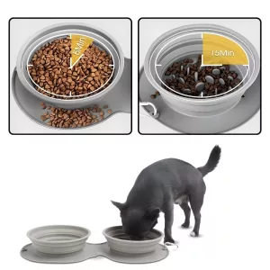 We nemen deze bakjes overal mee naartoe! De onderkant plakt goed en mijn hond eet echt langzamer, wat volgens de dierenarts veiliger is. Ik ben er heel blij mee.