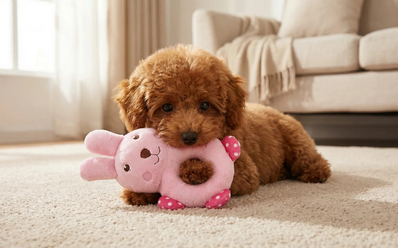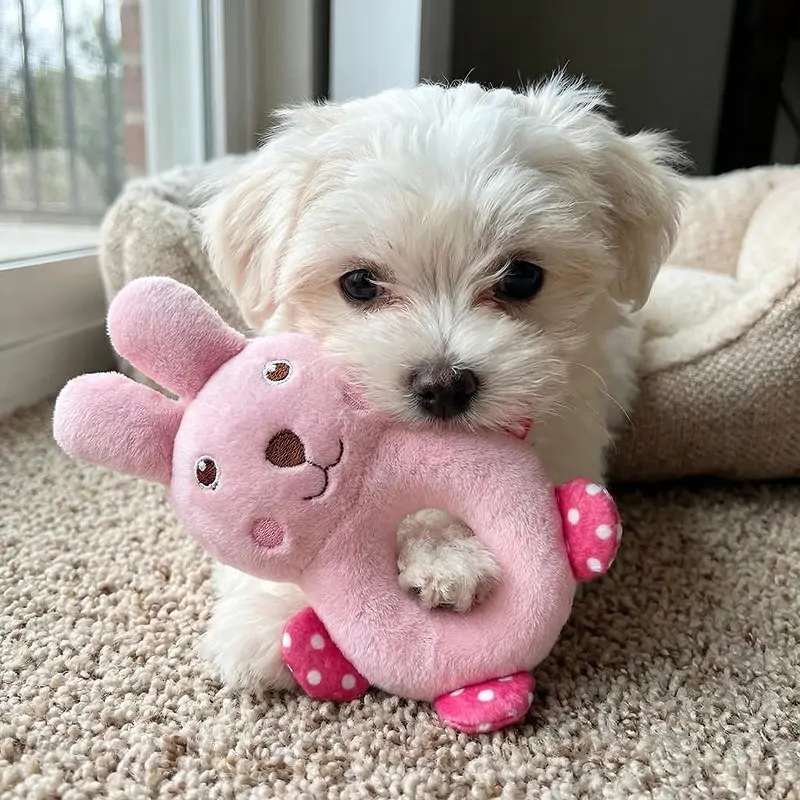 Mijn adoptiehond was in het begin zenuwachtig, maar dit knuffelige speeltje hielp enorm. Hij neemt het zachtjes in zijn bek en gaat naast me op de bank liggen, eindelijk zichtbaar ontspannen.