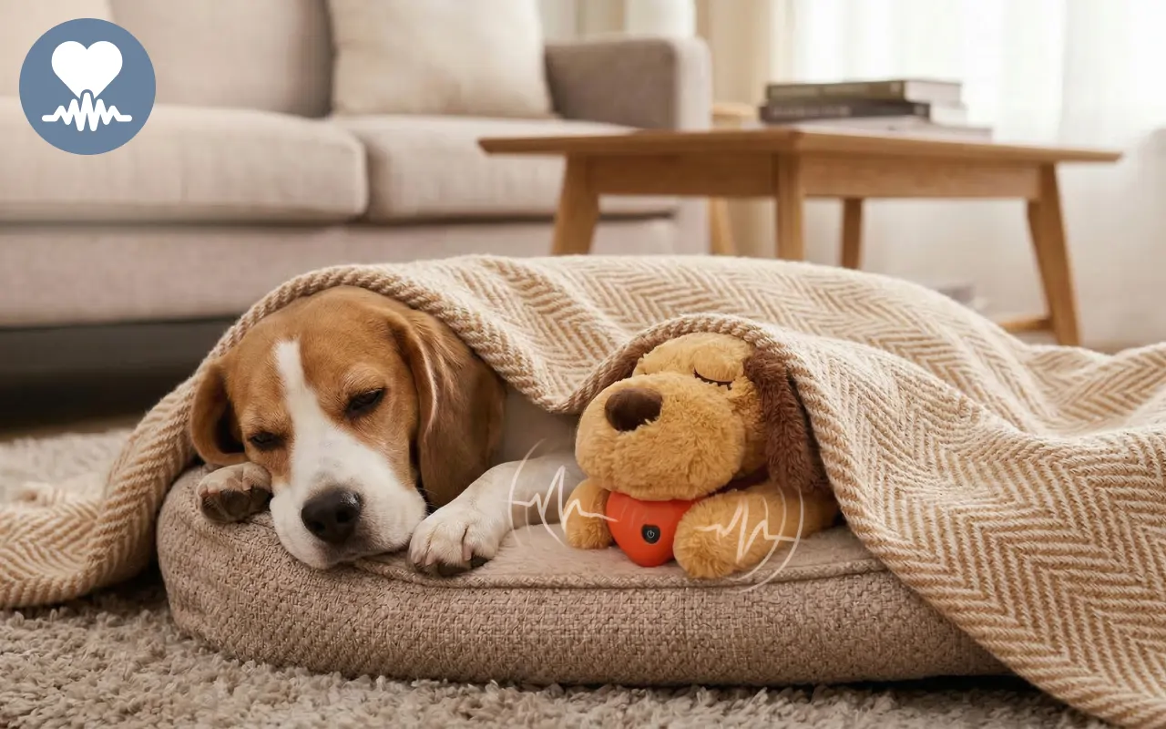 Een zacht hartslaggeluid stimuleert iedere nacht diepe, rustgevende slaap. Geen geblaf of gejank meer door plotselinge onrust of ongemak.
