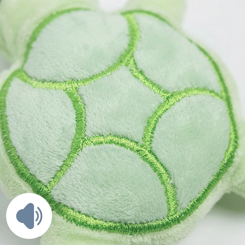 De schildpad gekocht voor de pup van mijn dochter. Hij knuffelt ermee in zijn bench en kauwt er zachtjes op voor het slapen. Het piepje werkt na weken nog steeds.