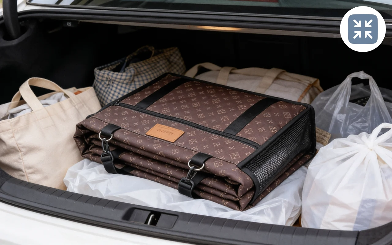 Het eenvoudig opvouwbare ontwerp zorgt voor geen gedoe bij het opbergen tussen ritten door. Netzakjes helpen speeltjes, lijnen en traktaties netjes te organiseren.