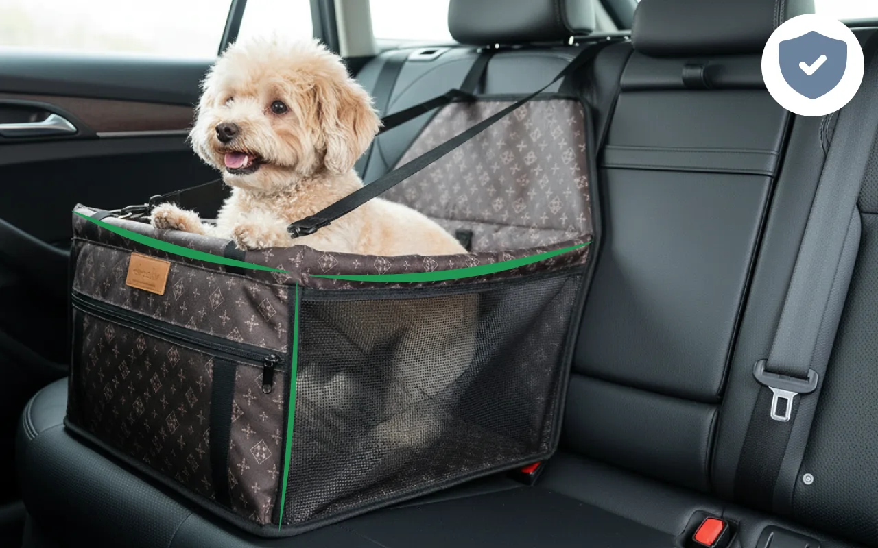 Je vriend blijft tijdens elke rit veilig op zijn plek. Bandjes en stevige zijkanten helpen plotselinge bewegingen of risicovol springen te voorkomen.