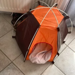 Dit is een mooie tent, maar ik wou dat hij in verschillende maten beschikbaar was, want mijn grotere hond wil er ook in, maar dat kan niet!