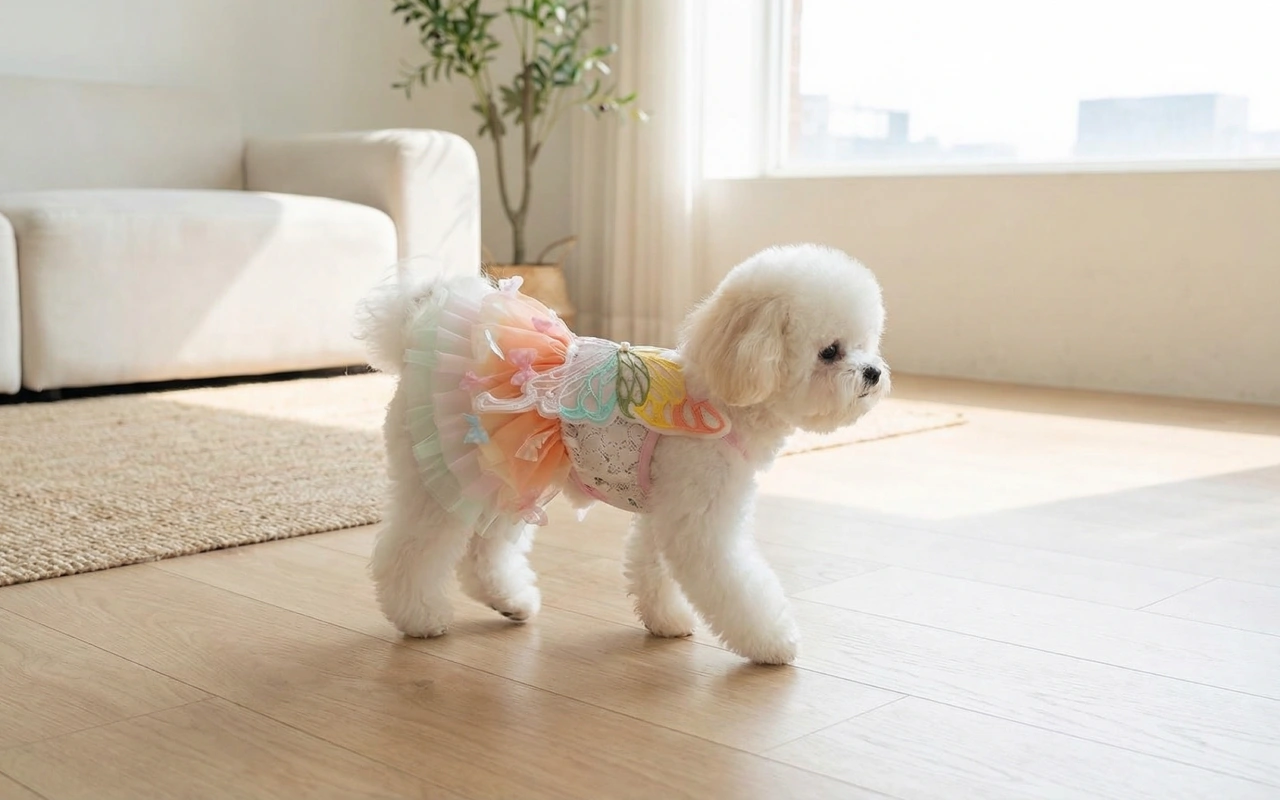Mijn hond heeft meestal een hekel aan kleding, maar dit vindt ze helemaal niet erg. Het gaat er snel aan en het rokje zwiert als ze loopt.