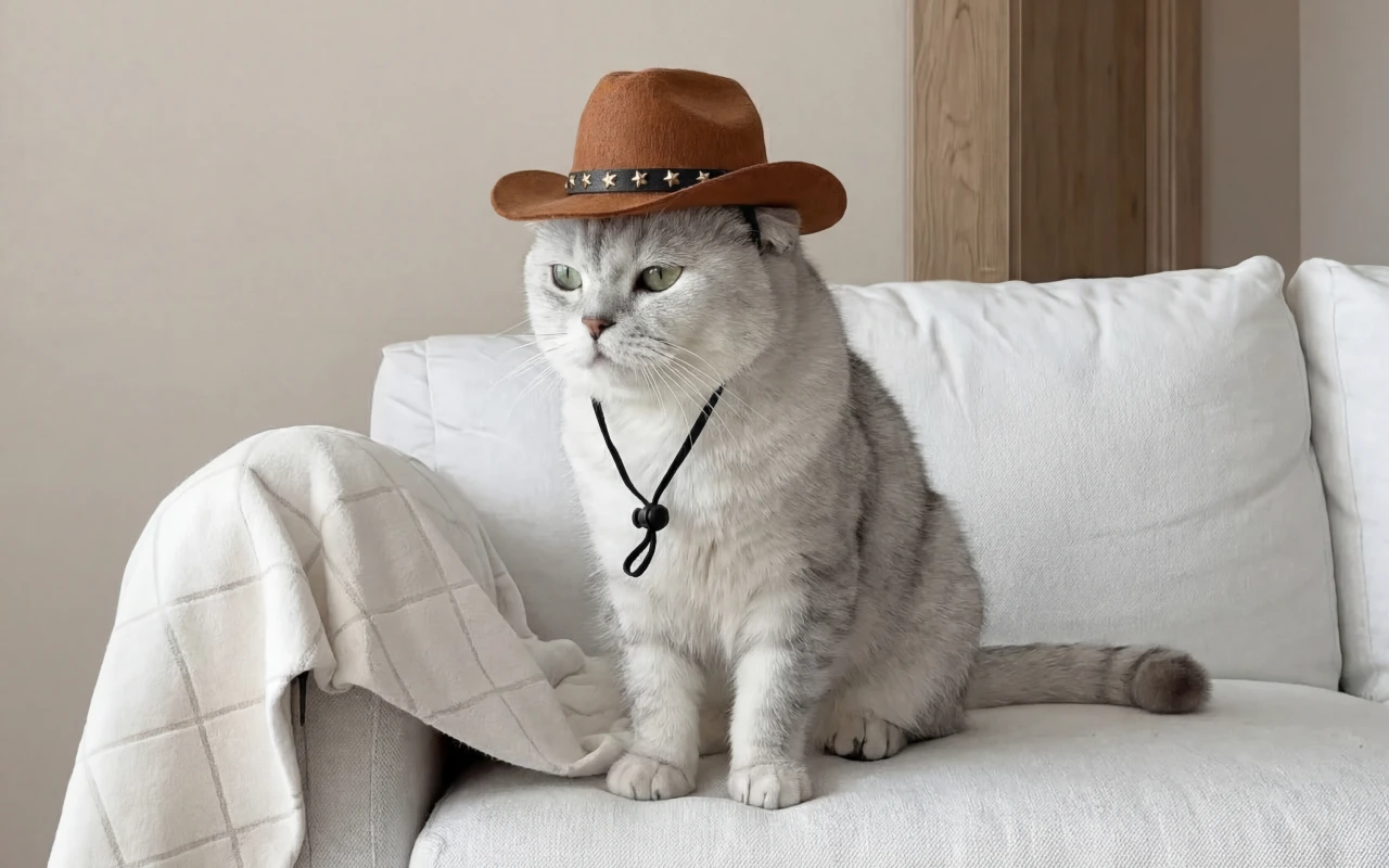 Ik bestelde de hoed voor mijn kat als grap, maar het werd een dagelijks ding. Ze ligt ermee op de bank en ziet eruit als een kleine sheriff.