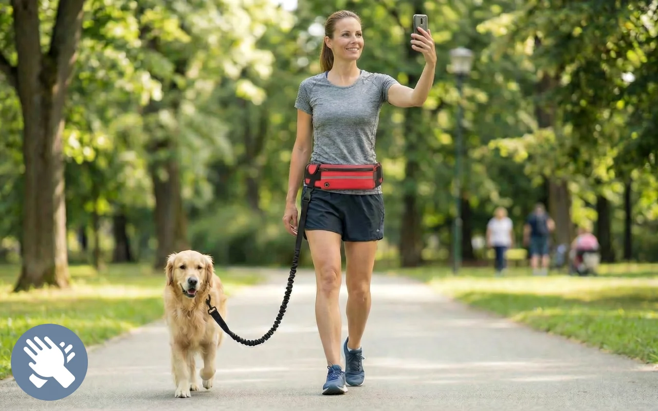 Nooit meer in de knoop met de lijn! Mijn pup loopt naast me en ik kan mijn telefoon gebruiken of van mijn smoothie genieten.