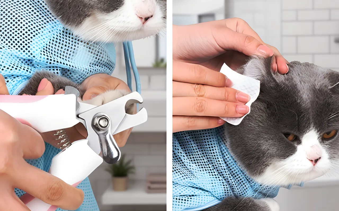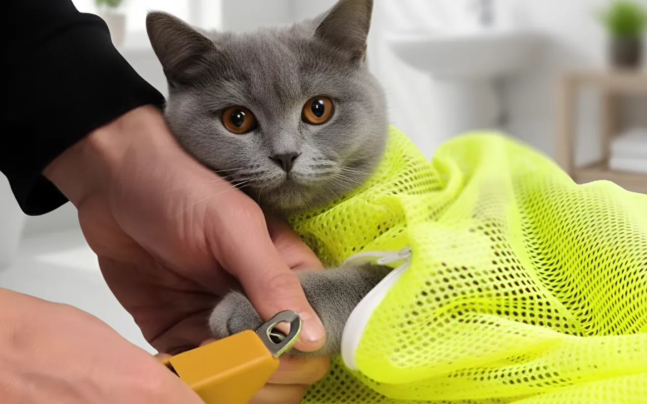 De netzak helpt me om de nagels van mijn kat te knippen.