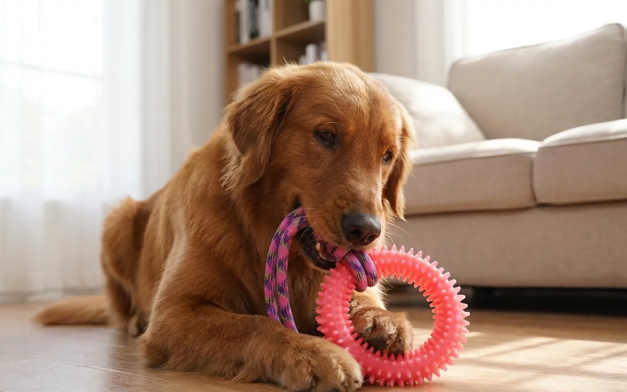 Spelen helpt honden zich rustig te voelen wanneer ze alleen thuis worden gelaten. Op het speeltje kauwen houdt ze bezig en beschermt je meubels tegen beschadiging.