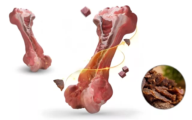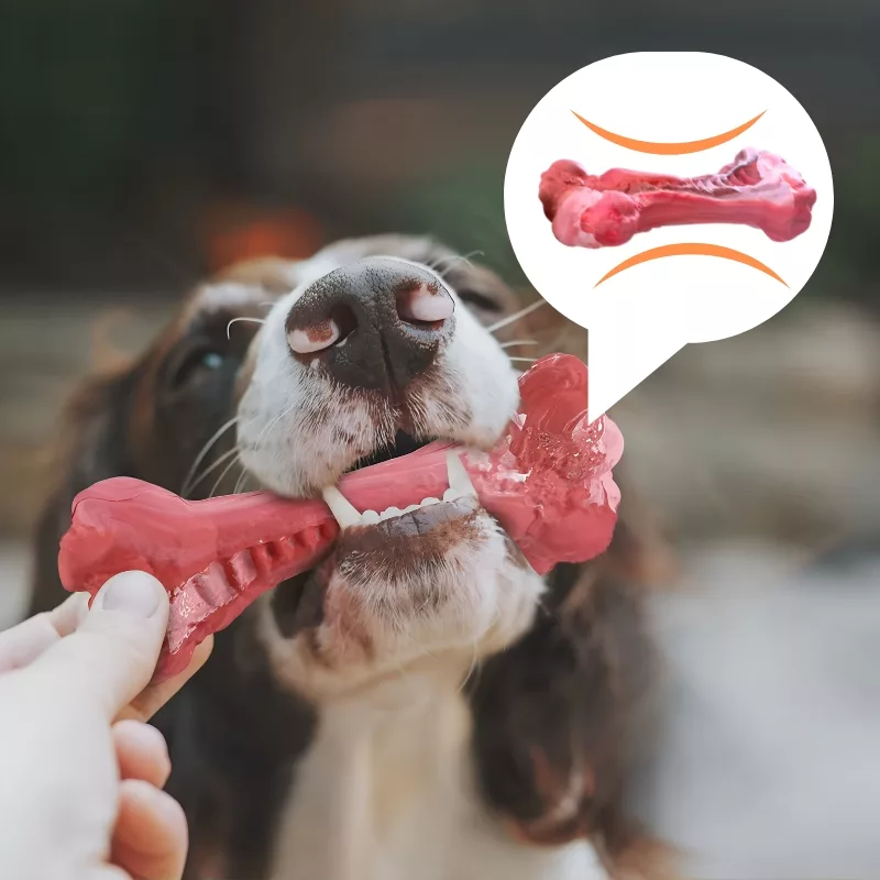 Dit hondenspeeltje is doordrenkt met een vleessmaak en onweerstaanbaar voor honden. Het is als een traktatie, maar dan zonder extra calorieën.
