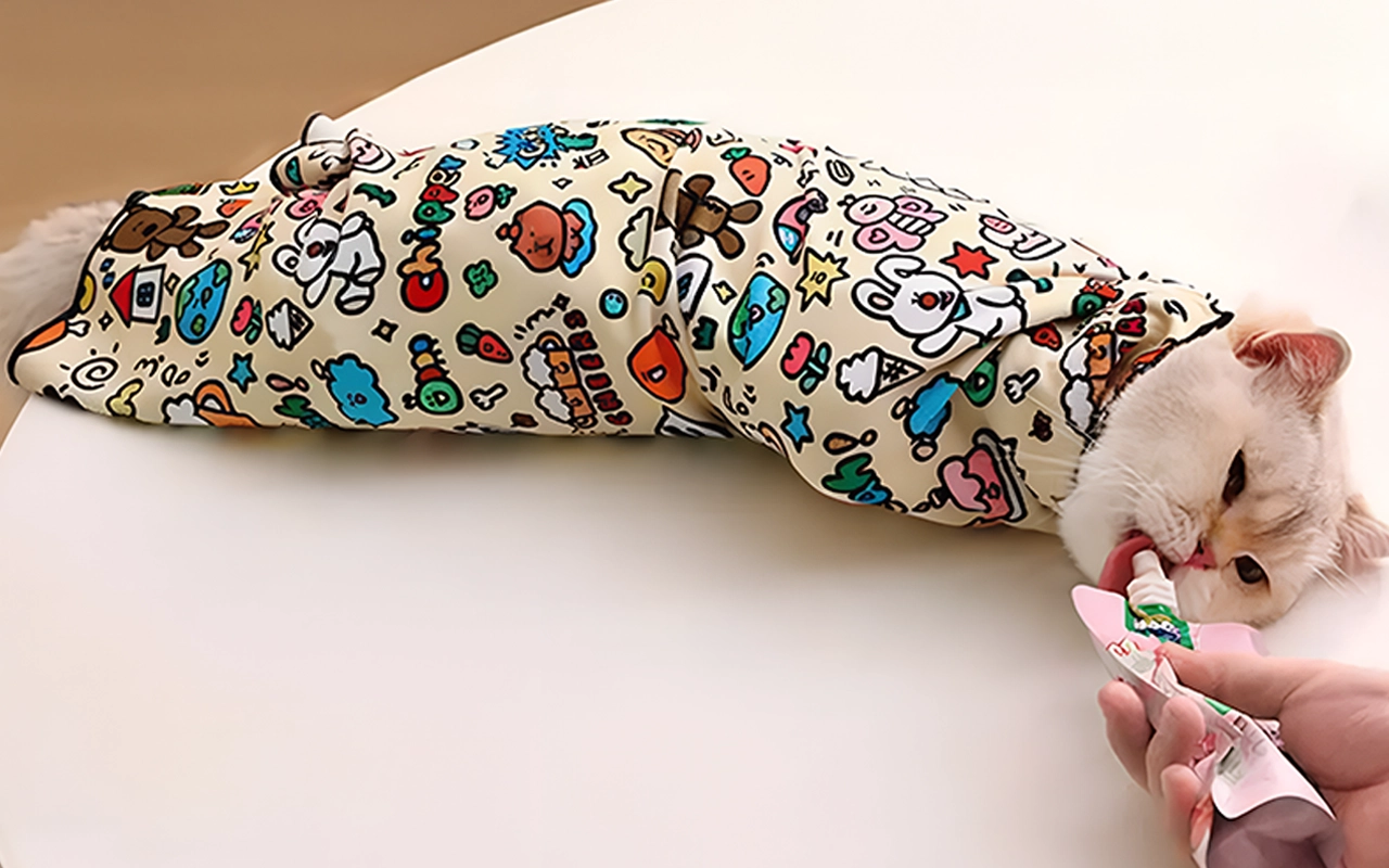In bad gaan was altijd chaos, maar nu is mijn kat kalm in deze wikkel. Het klittenband houdt alles perfect op zijn plek. Zelfs het patroon maakt me vrolijk.