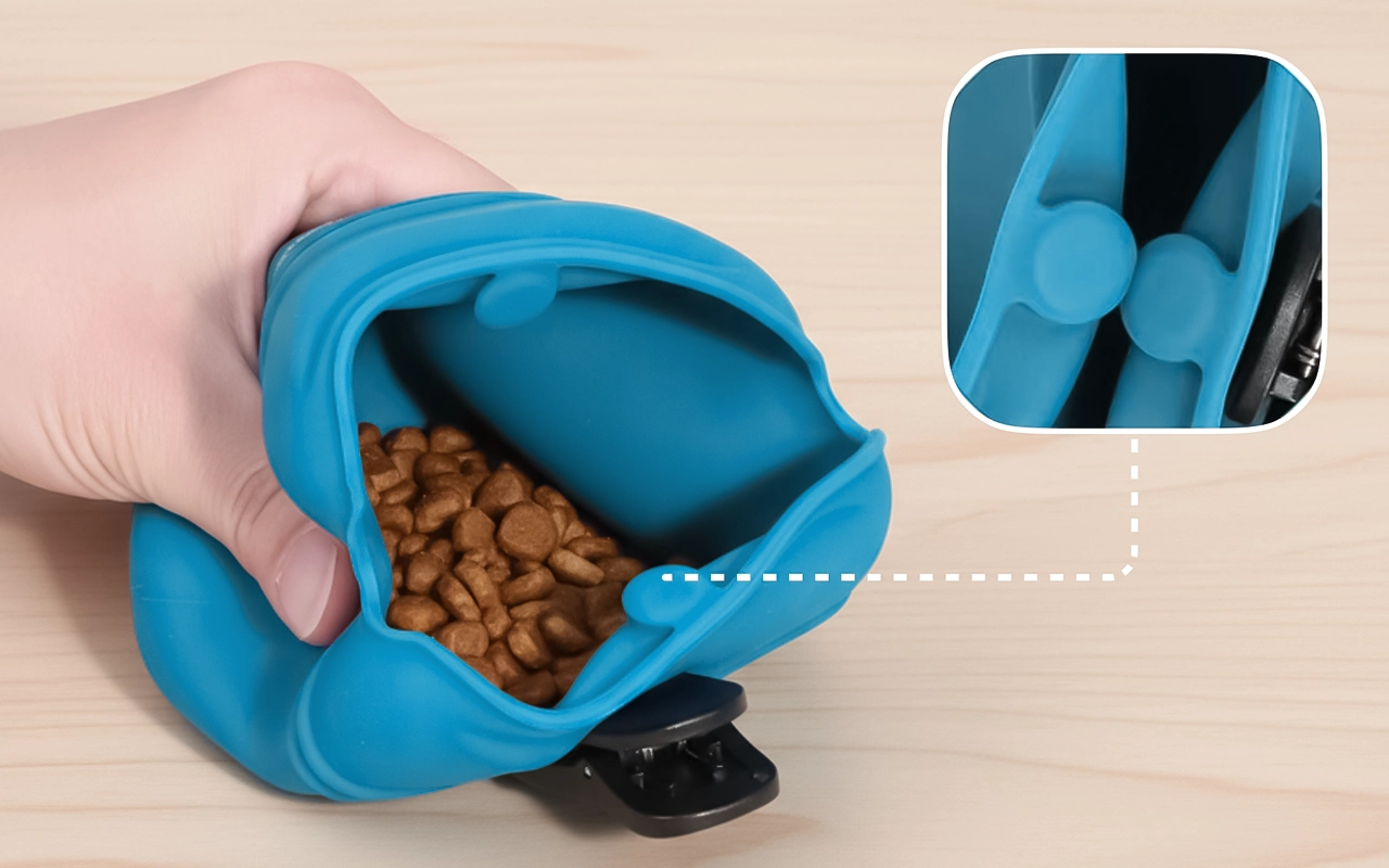 Nooit meer zoeken naar beloningen tijdens de training. De magnetische sluiting klikt snel dicht, zodat je eenvoudig bij de traktaties kunt.