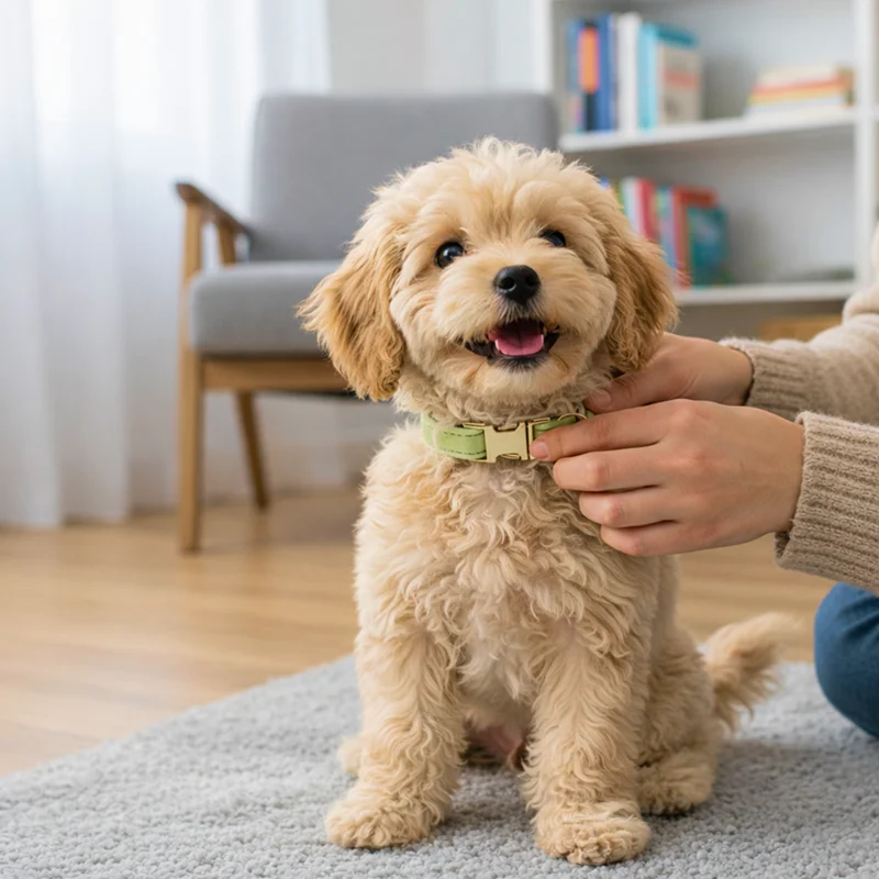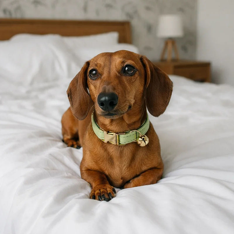 Primdog brengt elegante stijl en zachte zorg samen. De verstelbare pasvorm voorkomt ongemak of schuren rond de nek. Een klein belletje zorgt dat je nieuwsgierige vriendje veilig binnen blijft.