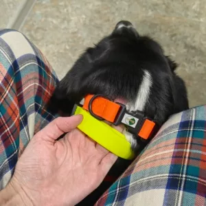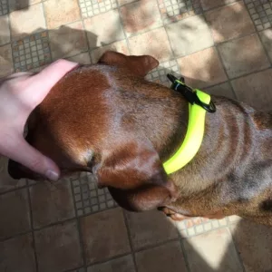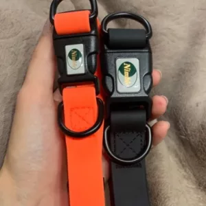 Deze halsband is zeer praktisch met zijn heldere, zichtbare kleuren. Het is gemakkelijk aan de lijnen te bevestigen. De snelle ontgrendeling is superhandig, hoewel het soms een beetje stijf is.